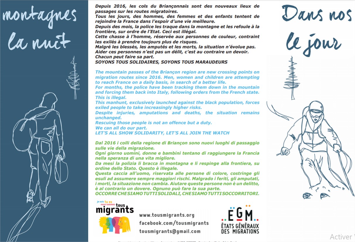 Petit topo sur la situation : les associations locales Briançonnaises organisent le 15 mars prochain une maraude géante pour dire non à la politique répressive de l’État Français qui dénie tous les jours le droit d’asile des migrant.e.s arrivé.e.s via l’Italie en France.