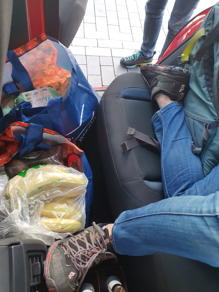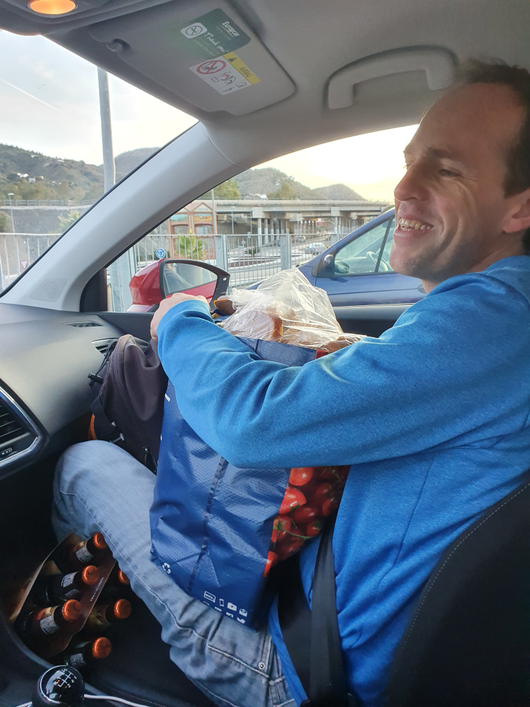 Arrivés à destination, le groupe part déjeuner sur la plage pour profiter du soleil andalou en attendant que la dernière grimpeuse n’arrive de Marseille. Après le déjeuner, une voiture part la chercher à l’aéroport tandis qu’une autre se charge d’aller faire les courses. Ces derniers devront faire preuve d’astuce pour caser toutes les victuailles dans une voiture déjà bien remplie avec les sacs. Mais le grimpeur n’est jamais à court d’idée : en exploitant tous les recoins et en se contorsionnant un peu, ça marche !