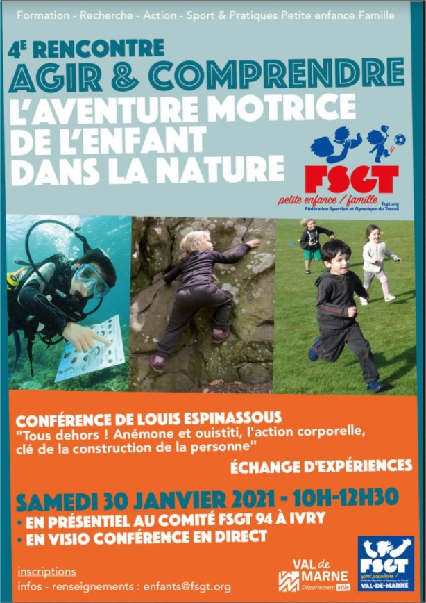 Vous l’avez lu dans la newsletter de l’enfance de décembre 2020, le 30 janvier prochain aura lieu les 4e rencontres AGIR et COMPRENDRE sous une forme adaptée au contexte actuel avec un temps d’apport de connaissance et d’échanges d’expériences de vous tous, acteurs et actrices de la FSGT qui composent la communauté éducative de l’enfance FSGT.