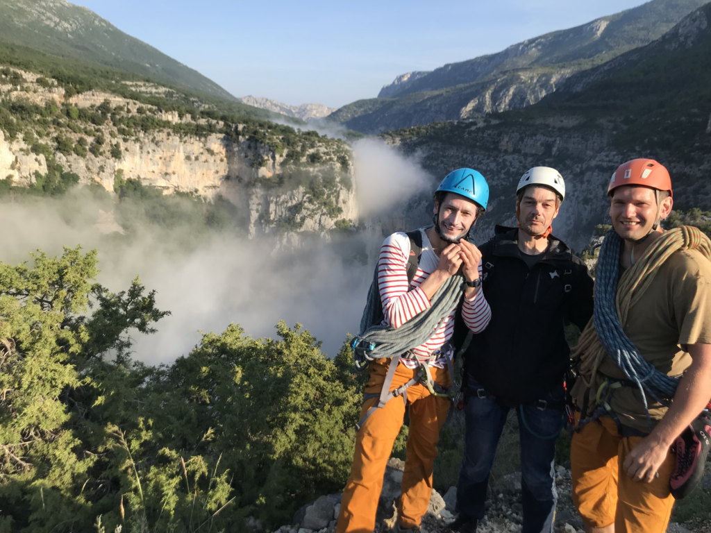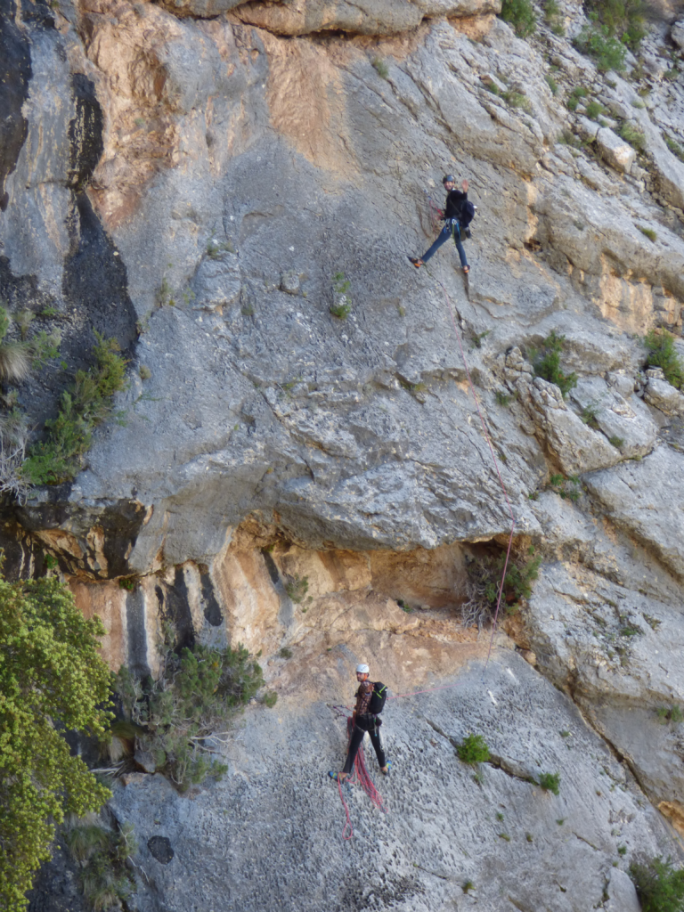 Jour 3 : couennes à la falaise Bastidon (Christophe+FX+Jimmy+Louise+Nicolas+Tristan) ; rando dans les gorges puis jusqu’à La Palud (Alex+Yannick)
