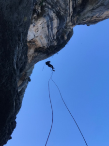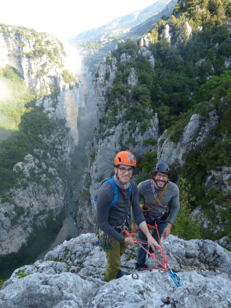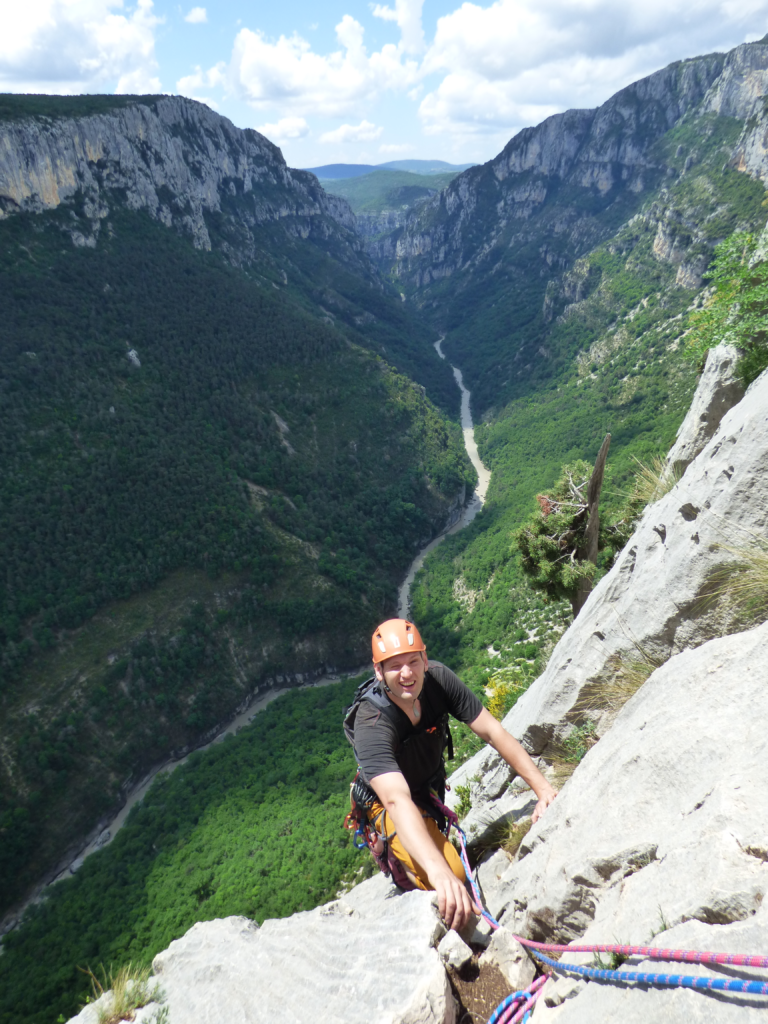 5ème et dernière journée, les esprits sont légers mais tout de même forcés à se projeter sur le retour du soir. Peu importe, on grimpera jusqu’à plus soif. Une flèche s’organise au secteur de la Dérobée sur l’Escalès, une seconde pour l’Arête de la patte de chèvre au Don de l’aigle, alors que deux autres préféreront les couennes de la falaise des Félines. L’escalade est belle et sans accroc, laissant le temps de nous rafraîchir et remettre les muscles en place dans le lac de Sainte-Croix.
