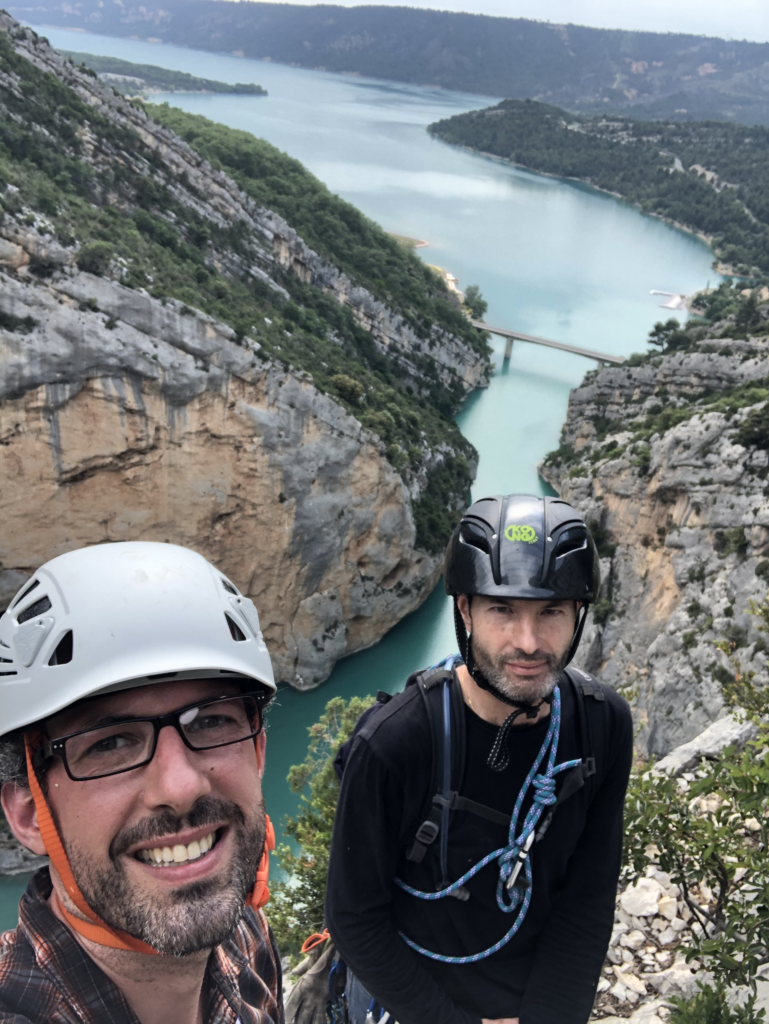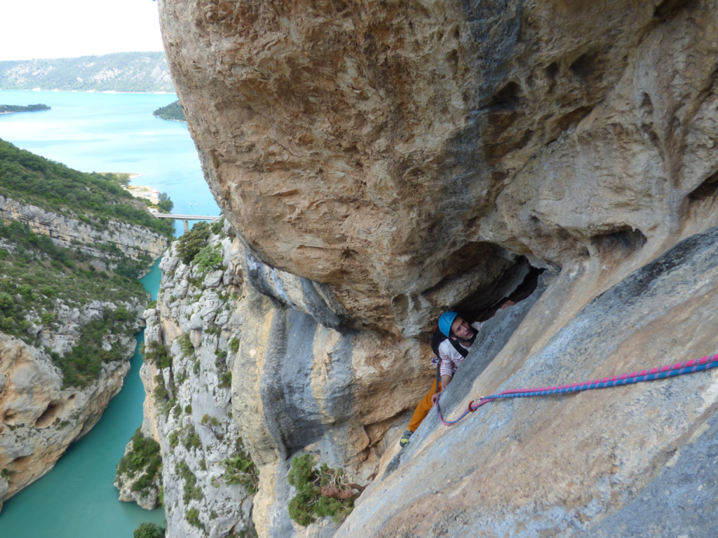 Le matin du second jour, les projets prennent de l’ampleur ! On poussera les voitures jusqu’à l’entrée des gorges où la vue sur le lac de Sainte-Croix vous prend aux tripes. Trois cordées exploreront le secteur Adieu Zidane, dont deux butteront sur la voie éponyme et son escalade exigeante ; la quatrième continuera jusqu’au site du Don de l’aigle, falaise récemment équipée qui surplombe le lac, offrant des panoramas qui compensent largement la perte d’ambiance du canyon. L’escalade est superbe.