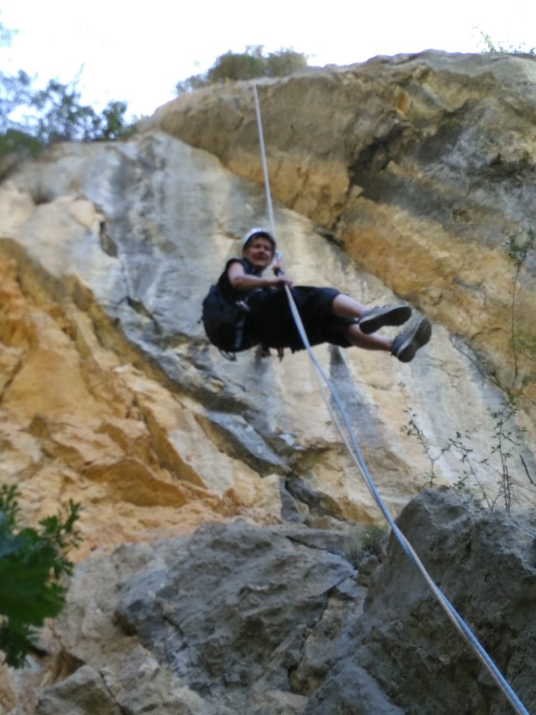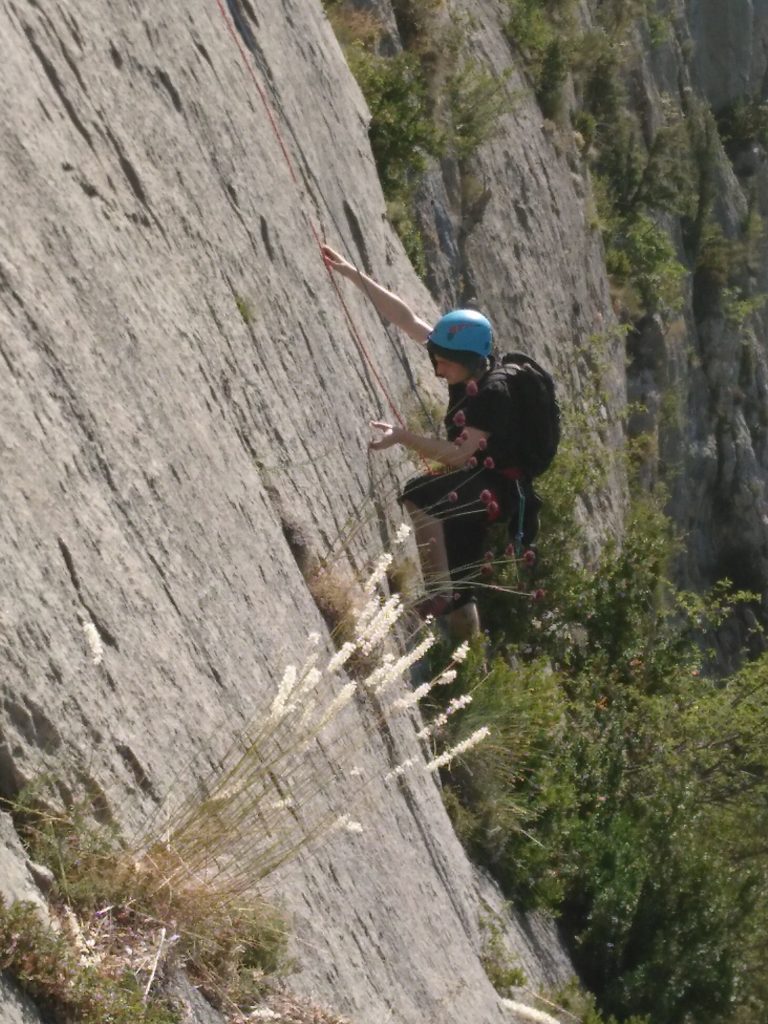 Anne-Sophie et Cyril sont allées faire la voie dans la partie gauche de l’Adrech. Il s’agit de naviguer dans 5 longueurs dont la cotation oscille entre le 5a et le 5b+. Comme les autres itinéraires de ce coin, la sortie consiste en une belle dalle bien équipée. On redescend par un rappel d’une quarantaine de mètres qui finit en fil d’araignée. Dans la ligne voisine, Polo et Rayan s’attaquaient à une voie dans le 6 nommée Merci madame le maire et qui commence par 2 belles longueurs en dalle de 6a.