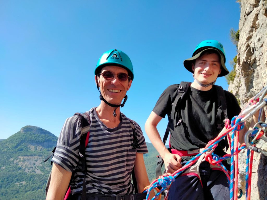 Rayan et Phillipe avaient repéré “Grand Coeur malade”, la voie la plue longue du Quiquillon, 200m avec un 6b de 45m conti. “Magnifique !” L’après-midi a été consacrée à faire un tour dans les gorges de la Méouge avec une belle voie psycho bloc (repère : flèche rouge 6a Alex). Le soir encore au Belléric, Rayan a tâté du 6a engagé.