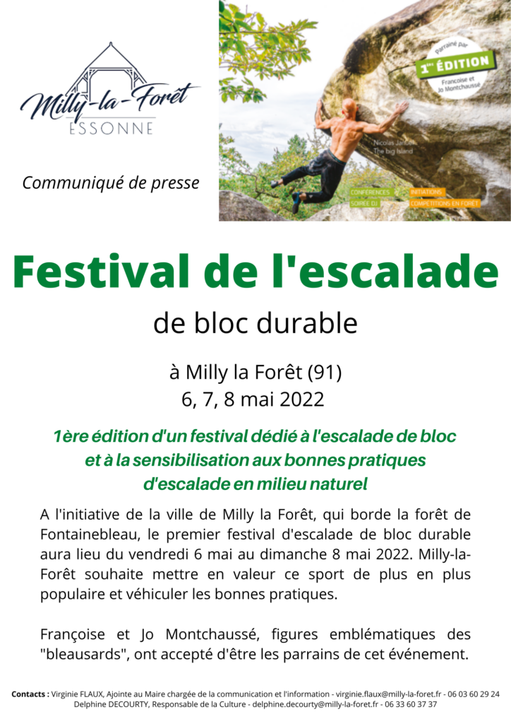 4 avril 2022 Festival d’escalade de bloc durable les 6,7,8 mai 2022 Retrouvez toutes les informations sur le site : https://www.festival-escalade-milly.com/