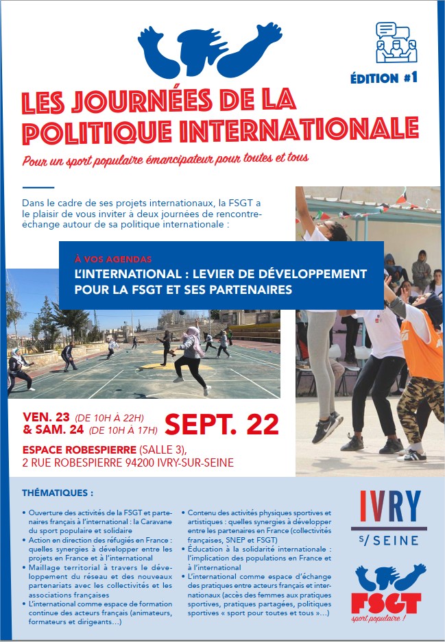 Je vous transmets une invitation à 2 journées de réflexion sur la politique internationale de la FSGT, ses thématiques et ses axes d’intervention. Vous trouverez ci-joint, le programme détaillé de l’initiative.