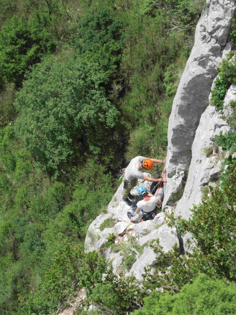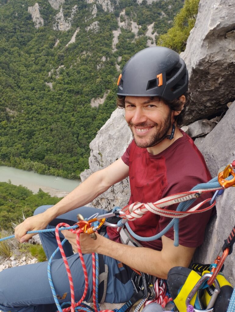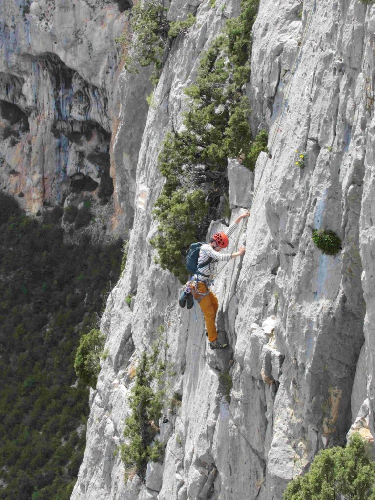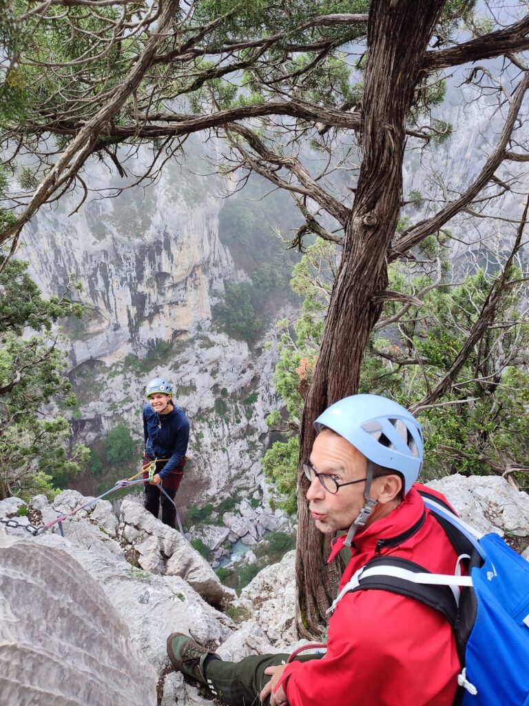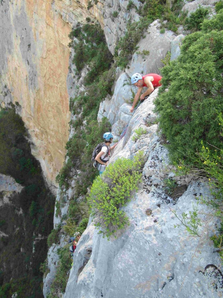 • Delphine, Louise, Peter et Tristan composent deux cordées à la conquête de Tarabiscotage verdonesque, suivant les conseils de notre hôte Nathalie. Les superlatifs manquent pour cet incroyable itinéraire tortueux en 9 longueurs, relativement homogène entre le 5c et le 6b+. Cette voie sera le must du séjour pour la plupart des membres du groupe !